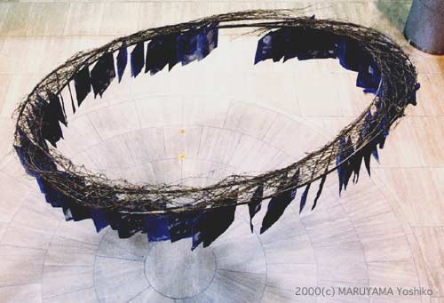 歴史は繰り返す。終わりのない唐草連続文様を、竹の細枝で混沌と渦巻くように編んだ人類史としての時間は、私達が過去に学ばなければただ一周して元の位置に戻る。環の下には、布片の厚みにも満たない一生を生きる世界の人々の表情が布の表面で翻る。